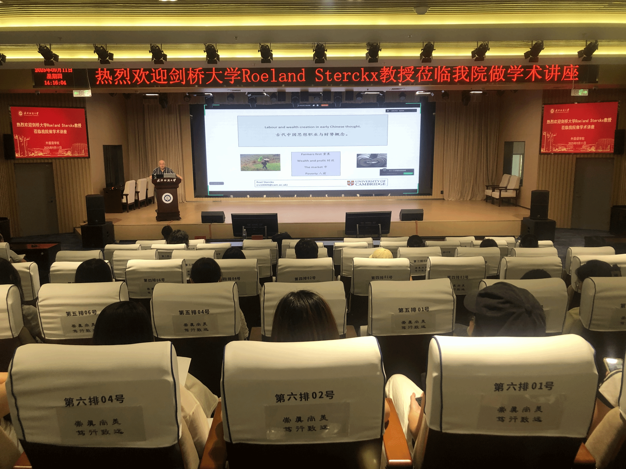 9月11日,皇冠体体育官网第99期“经纬译学”论坛在建全会堂稳健厅成功举办。本次论坛特邀世界著名科学家来鄂讲学计划专家、著名汉学家英国剑桥大学Roeland Sterckx教授作题为“Labour and wealth in early Chinese thought”的学术报告,论坛由院长谭燕保教授主持,皇冠体体育官网MTI教育中心老师和研究生参加了此次论坛。