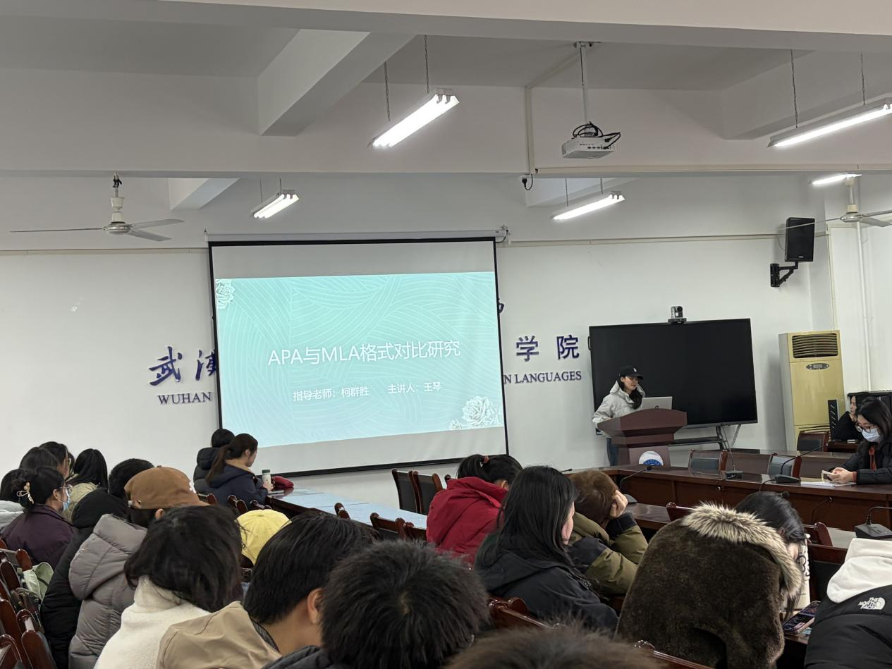 随后,2025级MTI研究生王琴以《APA与MLA格式对比研究》为题,开展了她的分享。王琴聚焦学术写作中常用的APA与MLA两种引用格式,先明确二者核心定位——APA适配心理学、社会科学等实证研究,MLA适用于文学、人文等文本分析类研究。随后从核心维度展开对比:适用学科与手册版本、标题页/首页格式规范、文中引用规则(如APA“作者-年份”vs MLA“作者-页码”)、参考文献排版要求(含作者姓名格式、标题大小写、出版信息呈现等)。她结合MTI论文写作实际,梳理格式使用中的高频错误与关键注意事项,同时给出清晰的格式选择指南,助力研究生掌握规范的学术写作格式,提升论文规范性与专业性。