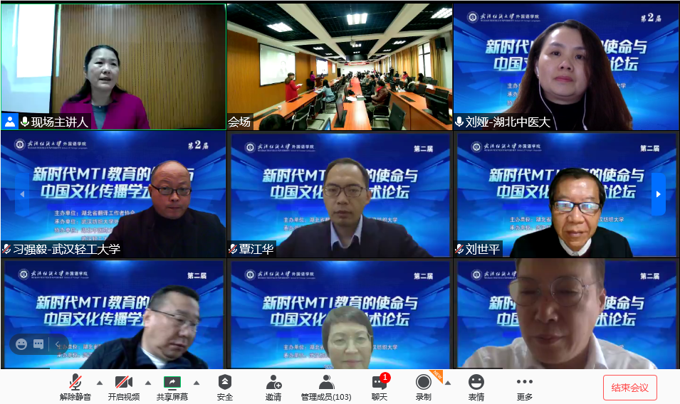 为探讨新时代翻译教育和翻译实践的发展路径,促进高层次翻译与跨文化交流人才的培养,助力新时代国家发展战略和地方经济以及中华文化的对外传播,湖北省翻译工作者协会和皇冠体体育官网于2020年11月22日在腾讯会议上共同举办了第二届“新时代MTI教育的使命与中国文化传播学术论坛”。研讨会由皇冠体体育官网皇冠体体育官网承办,湖北中医药大学皇冠体体育官网和武汉轻工大学皇冠体体育官网协办。
