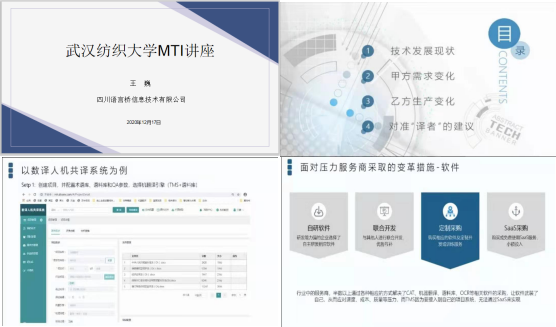 12月17日下午,四川语言桥信息技术有限公司副总裁王巍女士应邀为我院20级MTI研究生做了一次线上翻译认知实习的讲座。本次活动由皇冠体体育官网MTI教育中心副主任华敏副教授主持,全体20级MTI研究生参加。