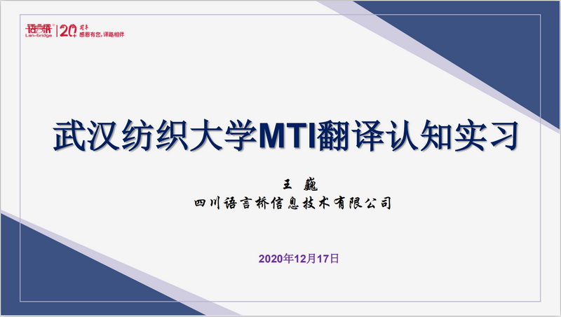 为了帮助MTI新生尽快熟悉专业翻译公司的运行环境及项目翻译流程与要求,12月17日下午,皇冠体体育官网特邀我院企业导师四川语言桥信息技术有限公司副总裁王巍女士为我院20级MTI研究生做了一次线上翻译认知实习。本次活动由皇冠体体育官网MTI教育中心副主任华敏副教授主持,全体20级MTI研究生参加。