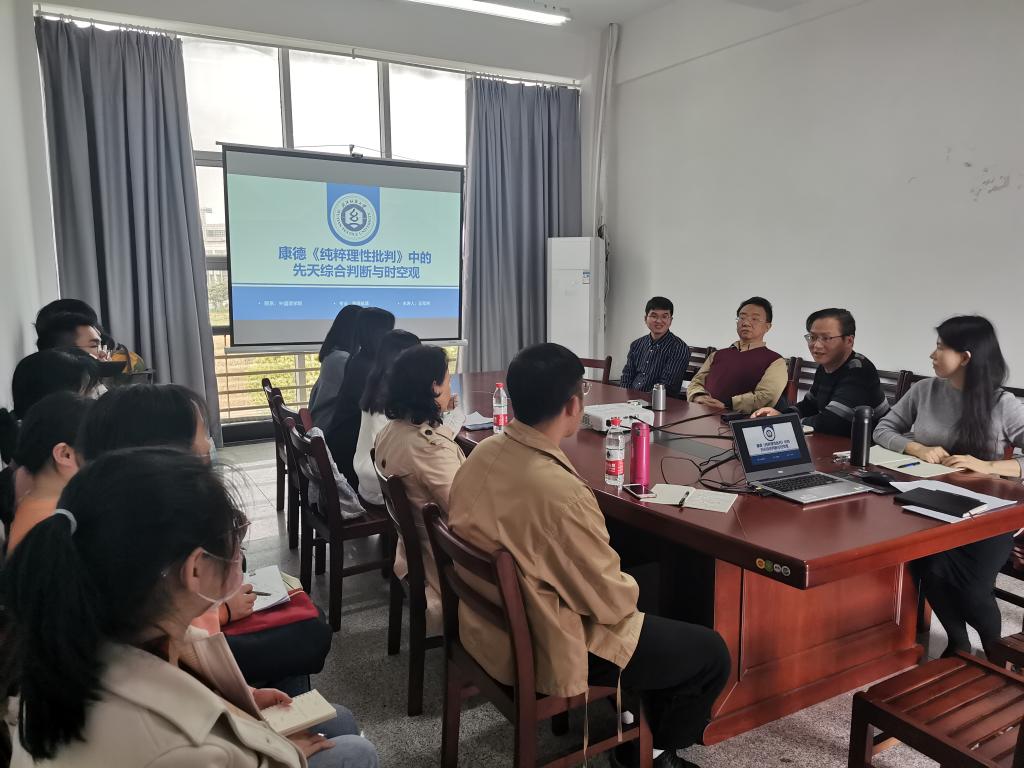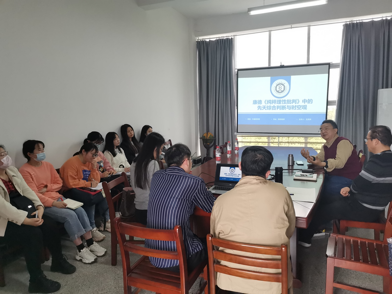 同学们在仔细聆听后进行踊跃发言提问。望云娇同学提出先天综合判断时空观两者关系以及放在一起探讨的意义。肖甜同学对先天综合判断与时空观两者之间进行了具体举例。谷莹莹同学提出问题:结合先天综合判断,如何解释哲学层面翻译的可译和不可译?