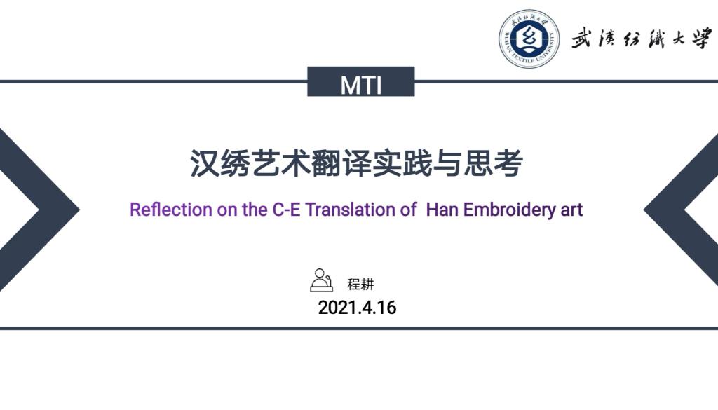 本次会议由周丹副教授主持,19级MTI研究生程耕和王克洲进行了汇报。程耕同学首先分享了“汉绣艺术翻译实践与思考”,主要从以下几个方面进行了分享:一,翻译任务描述。二,翻译过程。三,理论框架。四,案例分析。五,反思、双语能力以及不足。其中包括选题背景,汉绣文化的传承和研究现状。最后进行总结:找准目标读者,进行充分的译前准备,在译中过程中如何借助翻译辅助工具,技术支持语料库和译后审校等。
