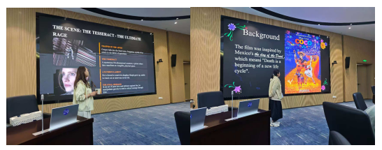 讲座结束后,皇冠体体育官网英语专业25级的5名同学依次上台,围绕不同经典电影展开展示分享,呈现了一场兼具语言表达与思想深度的视听盛宴。12501班刘乐颖以《星际穿越》为切入点,在观后感“Rage Against the Dark”中,结合影片剧情探讨了人类面对困境时的勇气与坚守;12502班张嘉仪聚焦《Coco》,以“Coco: A Song of Love and Memory”为主题,解读了影片中亲情与记忆的深刻内涵,传递了温暖的人文情怀。