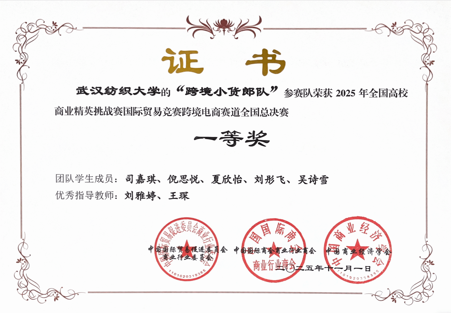 近日,全国高校商业精英挑战赛国际贸易竞赛跨境电商赛道全国总决赛圆满落幕。本届赛事吸引了来自全国28个省、自治区、直辖市的近500所高校、超5000支队伍同台竞技。经过激烈角逐,皇冠体体育官网商务英语专业司嘉琪同学领衔的“跨境小货郎”团队(商英司嘉琪,税收倪思悦,电信夏欣怡,英语刘彤飞,数媒吴诗雪)在刘雅婷和王琛老师的指导下斩获全国总决赛一等奖。