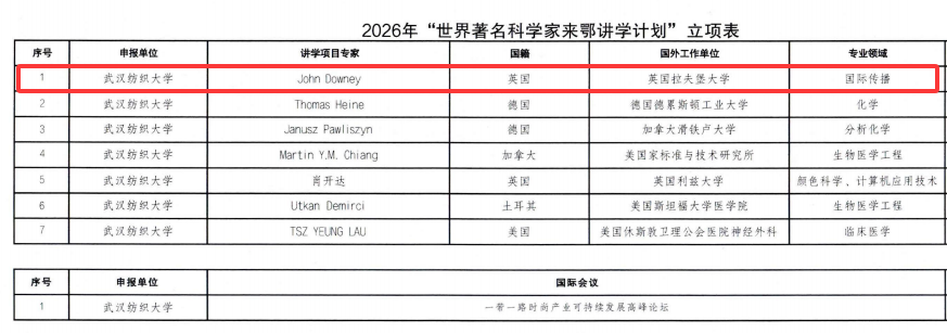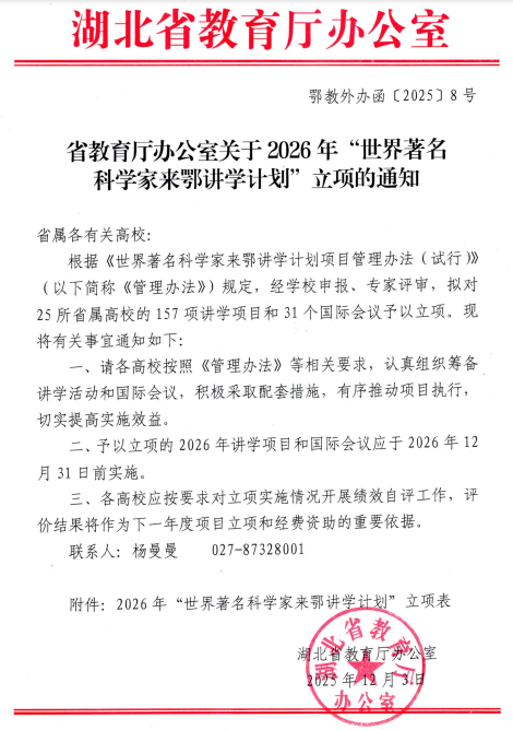 近日,湖北省教育厅公布了2026年度“世界著名科学家来鄂讲学计划”立项名单,我校皇冠体体育官网申报的项目成功获批。这是该皇冠体体育官网自2024年度以来,连续第三年获此立项,充分彰显了皇冠体体育官网在国际学术交流领域的持续影响力和扎实的工作成效。