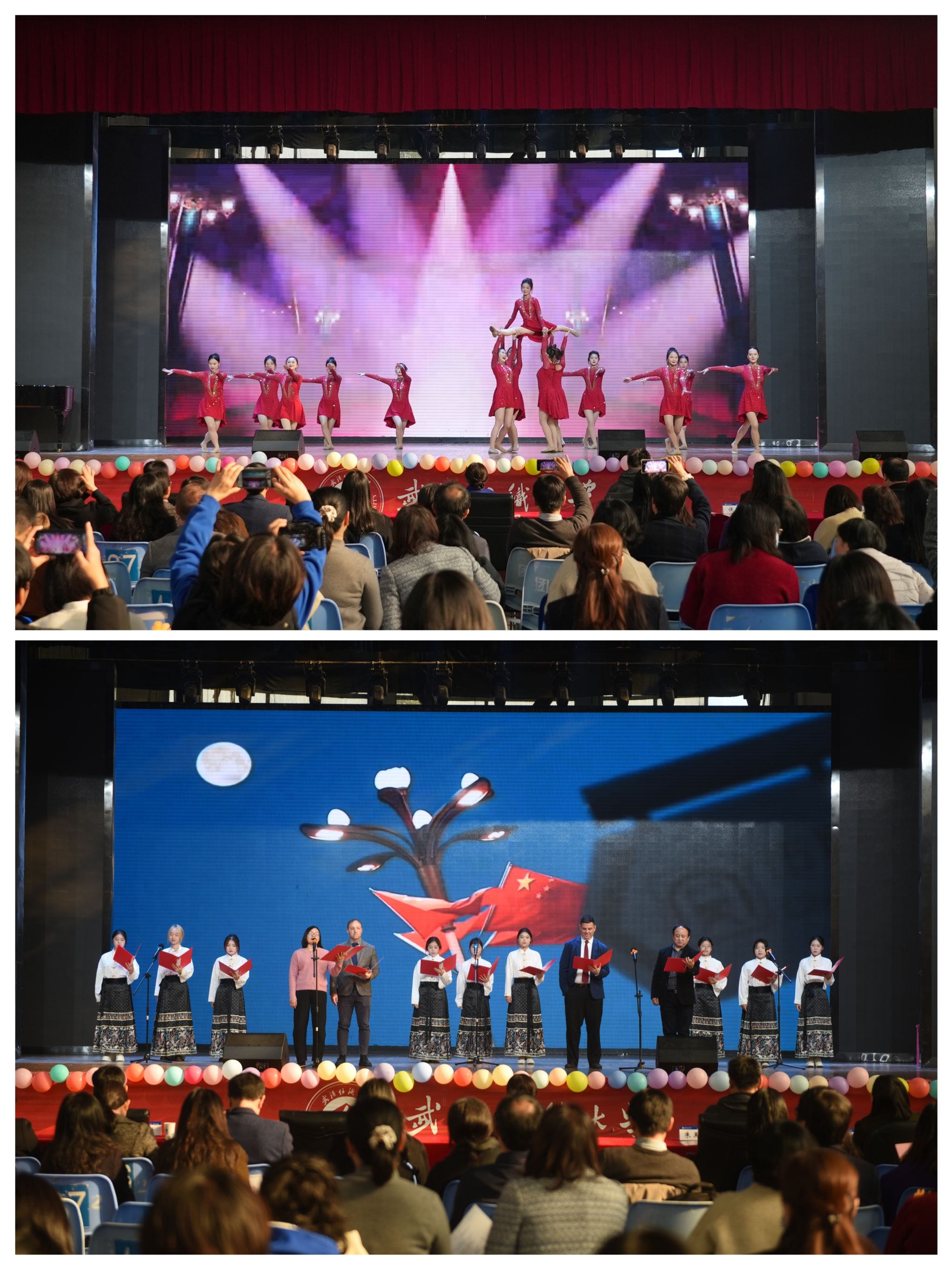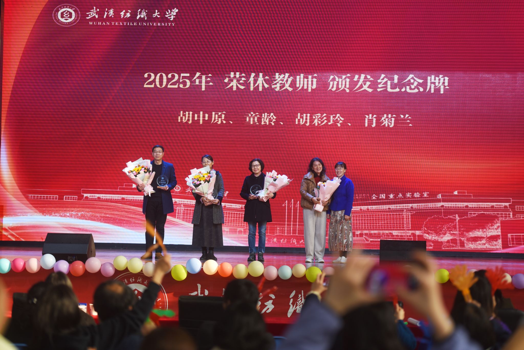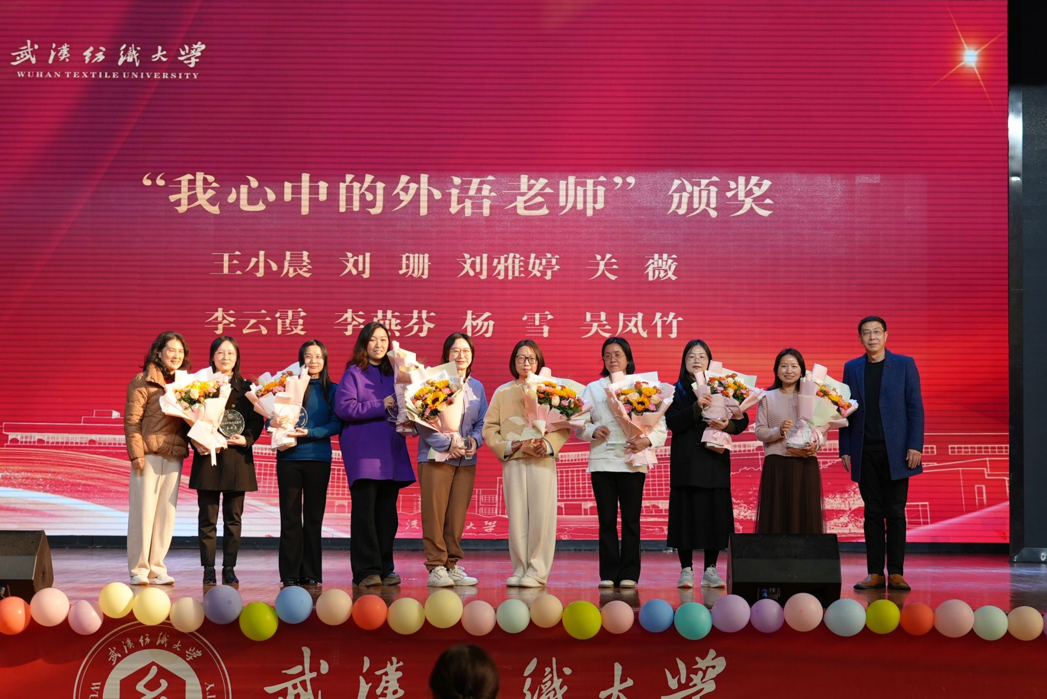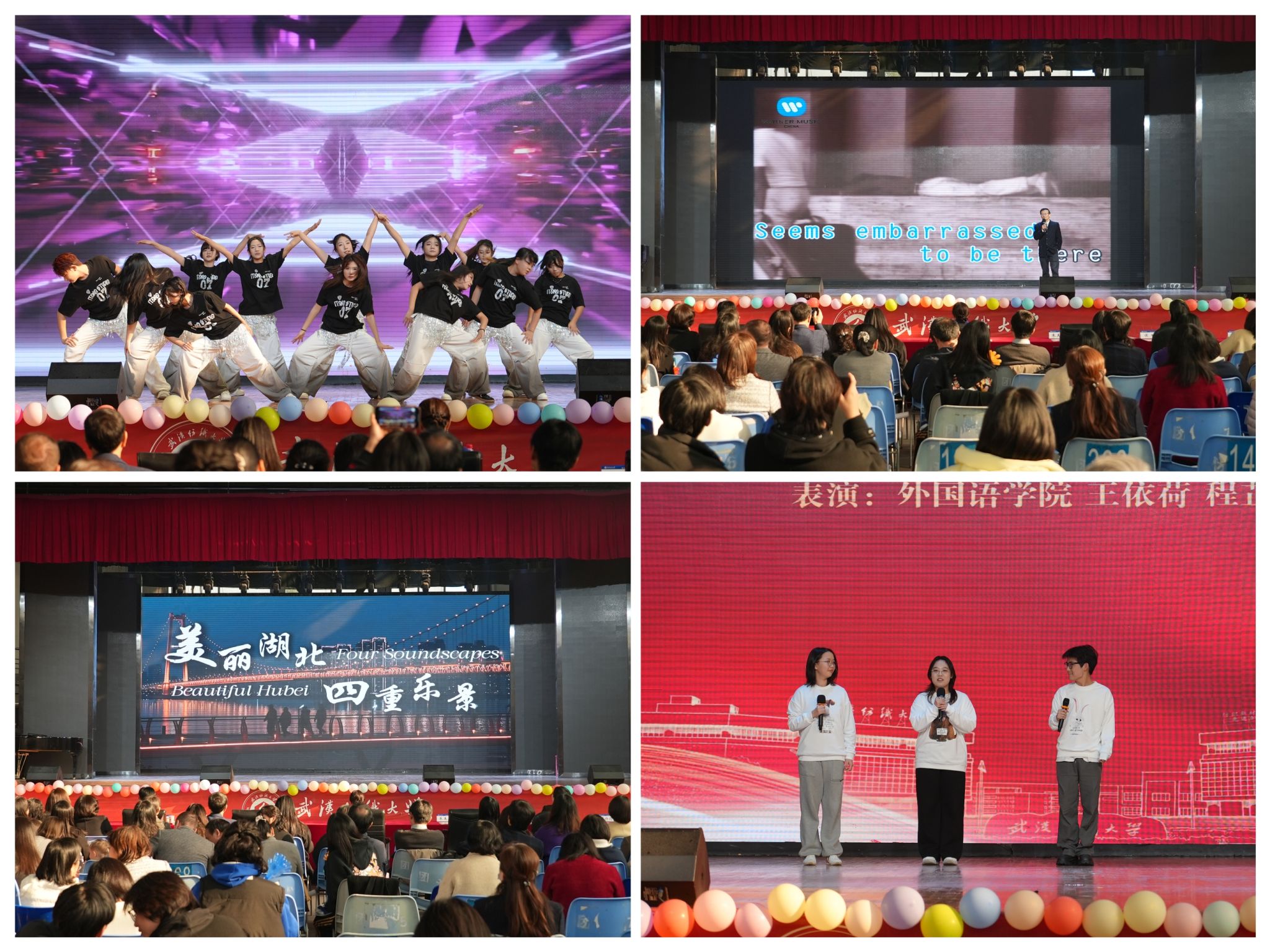 第二篇章“艺韵交织,四海和鸣” 凸显了中外文化的交融互鉴。员工英文独唱 Another Day in Paradise 深情动人;视频展示《“美丽湖北”印象之四重声景》以多语言音画描绘荆楚风韵;爵士舞《破界》与英语配音《爱宠大机密》则分别以现代舞姿和声音演技,展现了青年学子的创新活力与语言驾驭能力。本篇章特别设置了温情环节——谭燕保院长为2025年度荣休员工颁发纪念牌,致敬老师们数十载的耕耘与奉献;荣休员工代表胡中原、童玲、胡彩玲、肖菊兰相继为当选“我最喜爱的外语老师”的获奖员工颁奖,师道传承,感人至深。