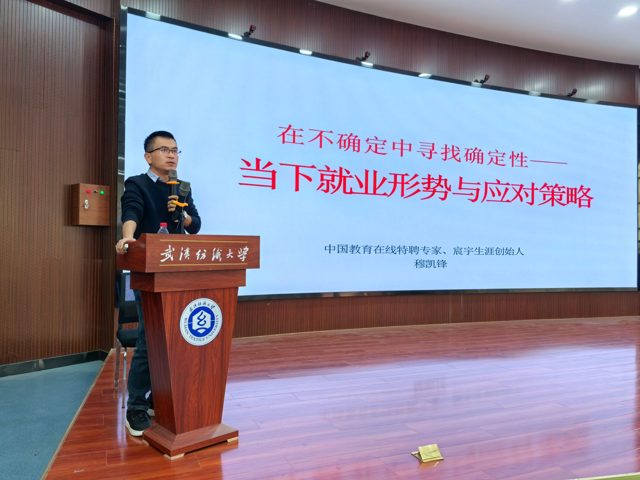 第二位讲师穆凯锋老师,宸宇生涯创始人、中国教育在线特聘专家、湖北省生涯导师团成员,以《在不确定中寻找确定性——当下就业形势与应对策略》为题,为同学们进行了宏观分析与路径指导。他深刻剖析了当前经济形势与毕业生规模持续扩大背景下的就业挑战,引用详实数据阐述了“学历内卷”、“考公考编热”等现象背后的逻辑。穆老师提出了“职业=行业+岗位+企业”的定位公式,引导员工结合自身专业、优势与资源进行科学规划。他强调了早规划、多实践、拿结果的重要性,并针对考公、求职、考研等不同发展路径给出了具体建议,鼓励同学们在不确定性中主动探索,提升核心竞争力,寻找属于自己的幸福职业生涯。