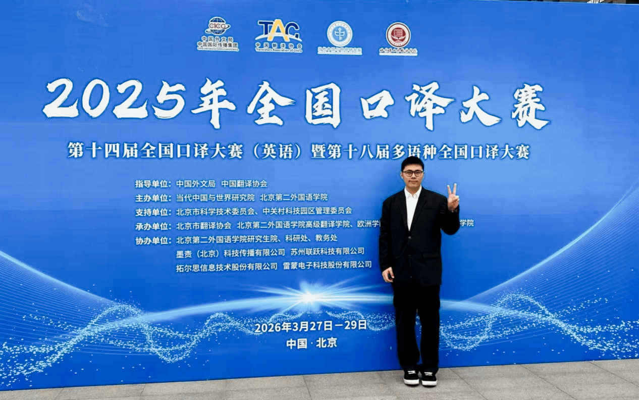 3月28—29日,第十四届全国口译大赛(英语)全国总决赛在北京第二皇冠体体育官网举行,皇冠体体育官网2024级翻译硕士孙康在曹婷老师和田禹老师的指导下赴京参赛并获得全国总决赛交替传译赛道三等奖。