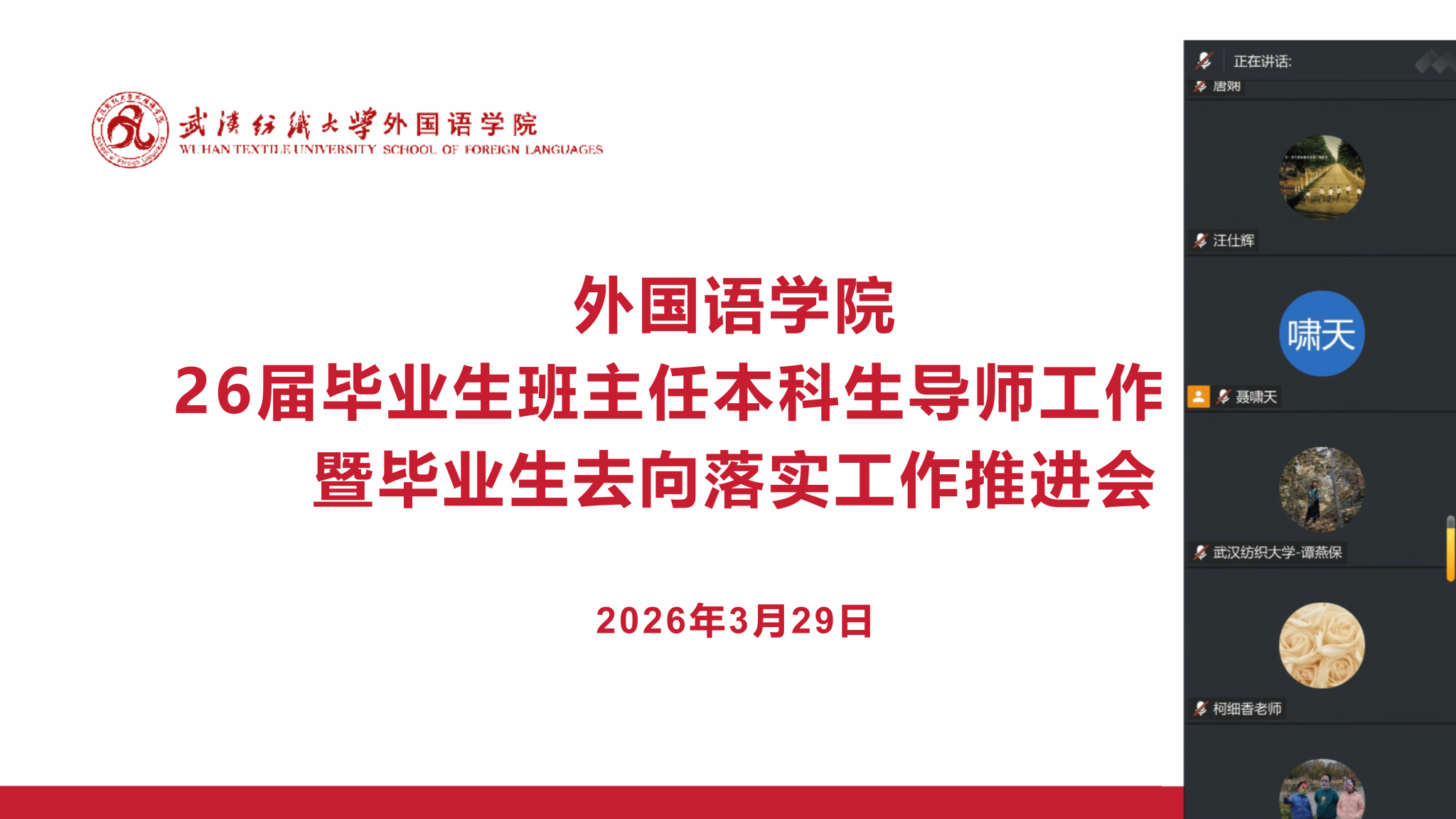 为精准做好毕业生就业分类指导与服务工作,3月29日晚,皇冠体体育官网通过线上平台举行毕业班班主任工作会暨毕业生去向落实工作会。皇冠体体育官网领导班子全体成员、毕业班班主任、本科生导师及毕业年级辅导员参加会议,会议由党委副书记彭阳慈航主持。