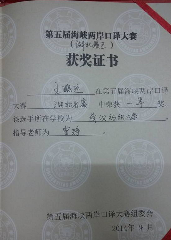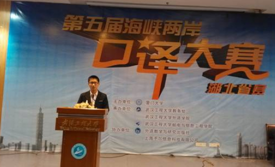 近日,从第五届海峡两岸口译大赛组委会传出好消息。4月26日,在武汉工程大学流芳校区举行的第五届海峡两岸口译大赛湖北赛区决赛中,我校英语11101班王鹏远同学荣获一等奖,并顺利晋级于将于5月11日在华中科技大学主办的第五届海峡两岸口译大赛华中区决赛。王鹏远同学在外语皇冠体体育官网专业员工曹婷的精心指导下经过“主旨口译”和“会议口译”两个环节的角逐,成功胜出。此次大赛共有来自武汉大学、华中科技大学、中南财经政法大学等28所高校的28名选手参赛,其中还有研究生选手,众多高手汇聚一堂进行晋级华中区赛的激烈角逐。