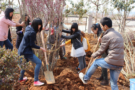 在活动现场,老师们躬身示范,对挖窝、放苗、培土、浇水等环节进行耐心讲解并示范,同学们则认真操作各个环节。尽管部分同学来自大城市,从未参与过这样的活动,但他们依然不畏辛苦,不怕脏,不怕累,精心种下每一棵树。经过两个多小时的努力,成功种植了所有树苗。