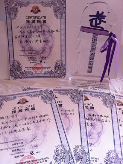 (大赛“发展武术贡献奖”、“优秀志愿者”获奖证书及奖牌)