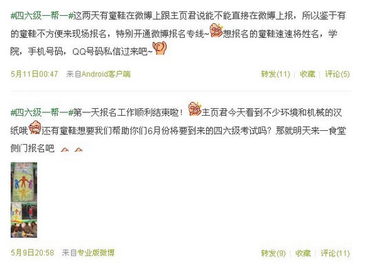 皇冠体体育官网分党委副书记卫冬妹说:“皇冠体体育官网担负着全校公共英语的教学任务,外语皇冠体体育官网英语专业的同学们应该利用自己的专业特长服务全校同学。活动中采用的同学们喜爱的微博参与其中的方式,便利了同学们网络报名、咨询、辅导,拉近了与同学们之间的距离,适应了信息时代开展志愿者活动的需要”。专业志愿者们热情友好、乐于助人,“赠人玫瑰,手留余香”的志愿者精神和行动温暖了备考同学们的心。据悉,该活动是外语皇冠体体育官网英语专业志愿者服务活动之一,每学年将举办两次左右的等级考试咨询辅导活动。
