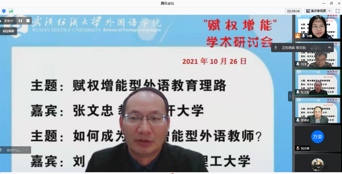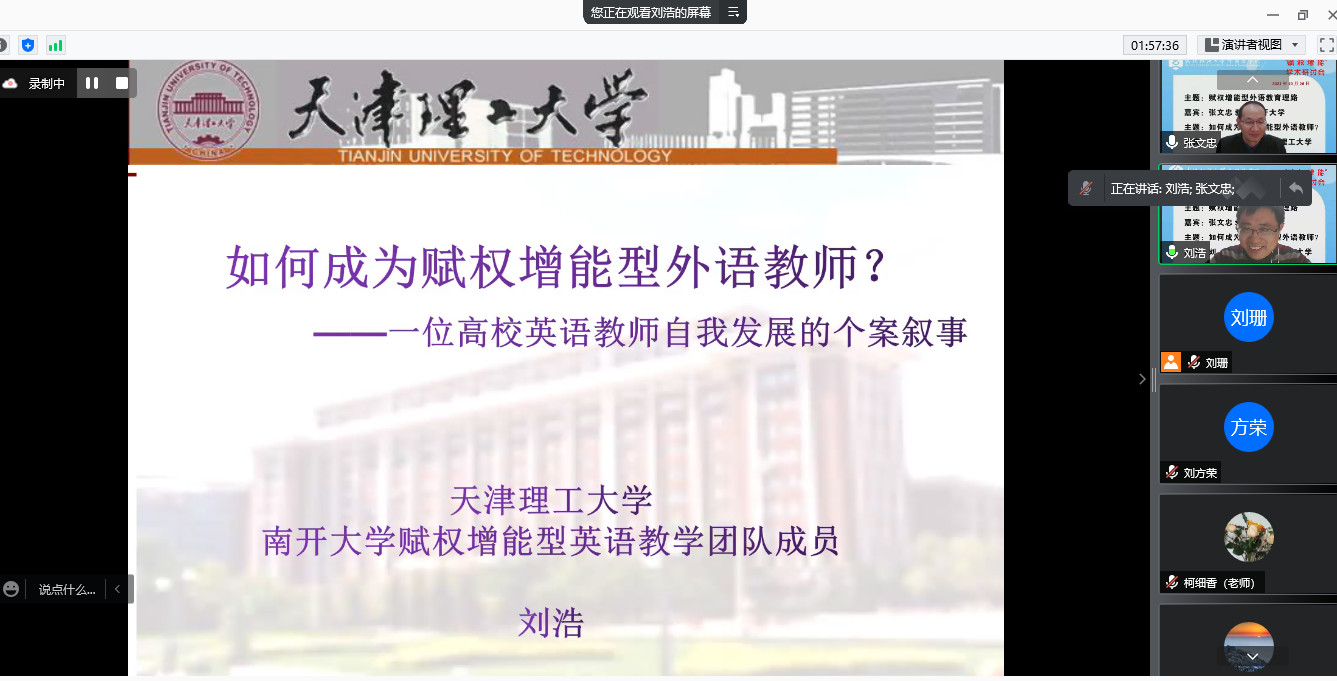 2021年10月26日,皇冠体体育官网皇冠体体育官网于线上举办了赋权增能学术研讨会。南开大学赋权增能型英语教学团队负责人张文忠教授和团队成员天津理工大学刘浩博士应邀做了主旨发言。会议由皇冠体体育官网罗绮伦副院长主持,皇冠体体育官网院长谭燕保、党委书记胡中原及皇冠体体育官网赋权增能团队近三十位员工参加了会议。