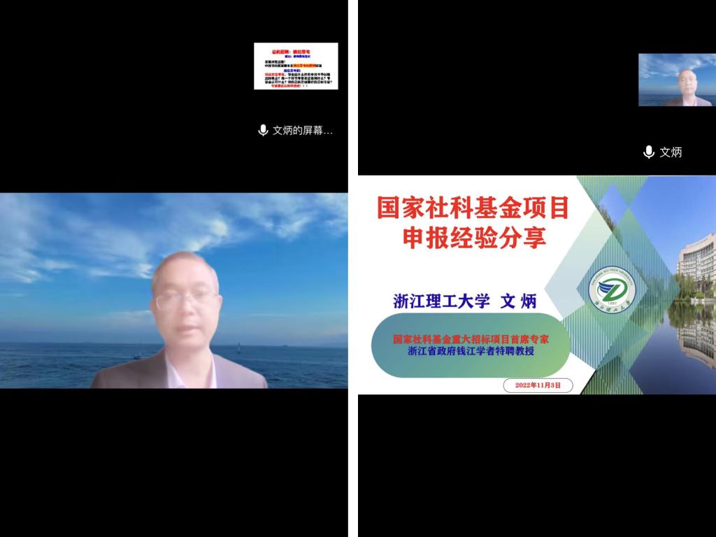 为进一步提升皇冠体体育官网员工国家级项目申报书的撰写水平,助力2023年国社科基金项目申报工作,11月3日下午,皇冠体体育官网特邀请国家社科基金重大招标项目首席专家、浙江理工大学皇冠体体育官网院长文炳教授在云端为全体员工作了题为:国家社科基金项目申报经验分享的学术讲座,讲座由院长谭燕保教授主持。