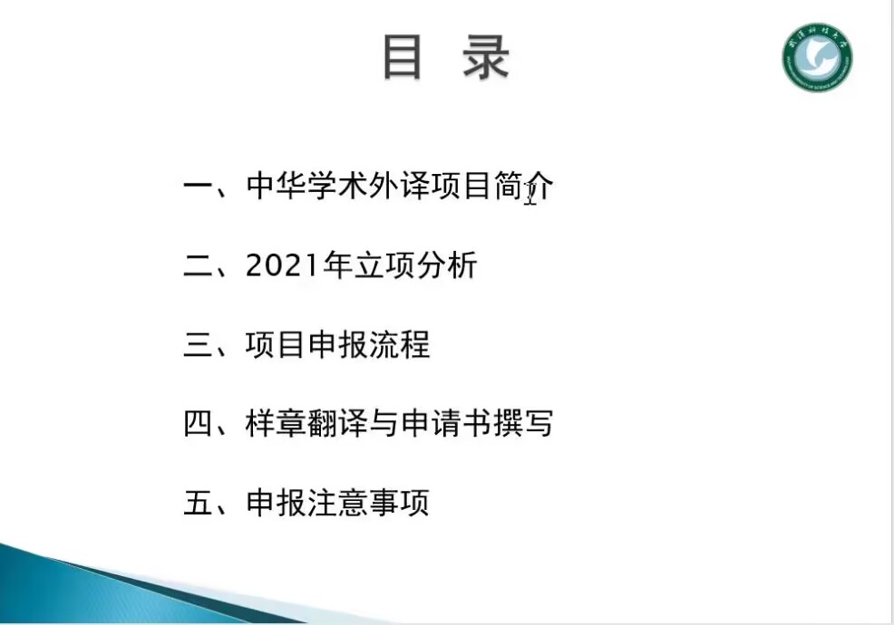 2023年国家社科基金申报工作已经拉开了帷幕。为做好中华学术外译项目的申报动员工作,12月23日晚7点,皇冠体体育官网邀请到了武汉科技大学皇冠体体育官网副院长李金云教授在云端做了题为“国家社科中华学术外译项目的选题与申报”的学术讲座,讲座由皇冠体体育官网刘方荣副院长主持,全体员工及MTI部分研究生在线上聆听了此次讲座。