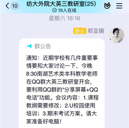 4月18日,大学英语第三教学部全体员工召开QQ电话会议,集中研讨下一阶段教学工作部署,大学英语第三教学部南湖校区全体员工参加会议,会议由第三教学部主任郑亚娟主持。