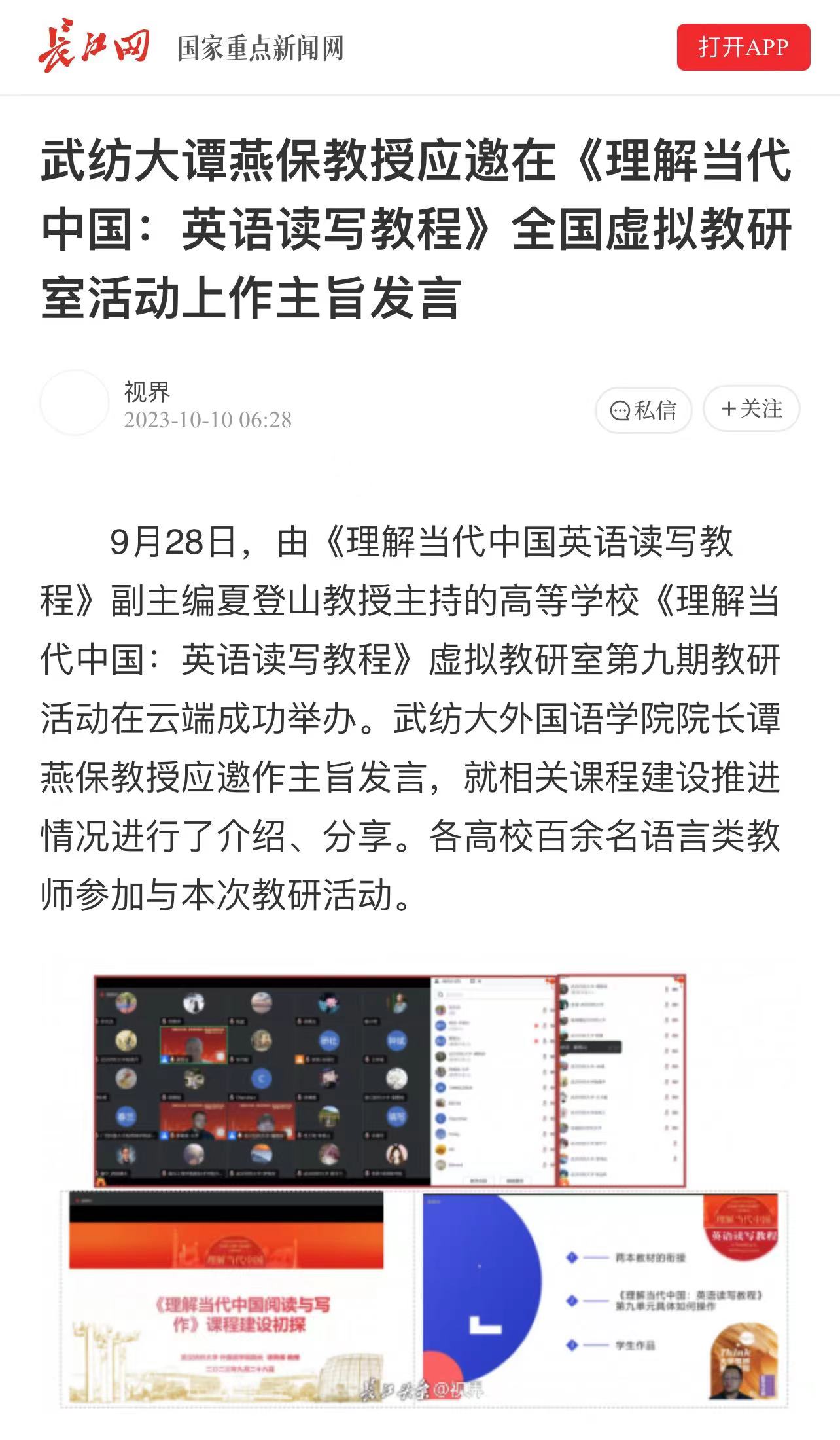 9月28日,由《理解当代中国英语读写教程》副主编夏登山教授主持的高等学校《理解当代中国:英语读写教程》虚拟教研室第九期教研活动在云端成功举办。武纺大皇冠体体育官网院长谭燕保教授应邀作主旨发言,就相关课程建设推进情况进行了介绍、分享。各高校百余名语言类员工参加与本次教研活动。