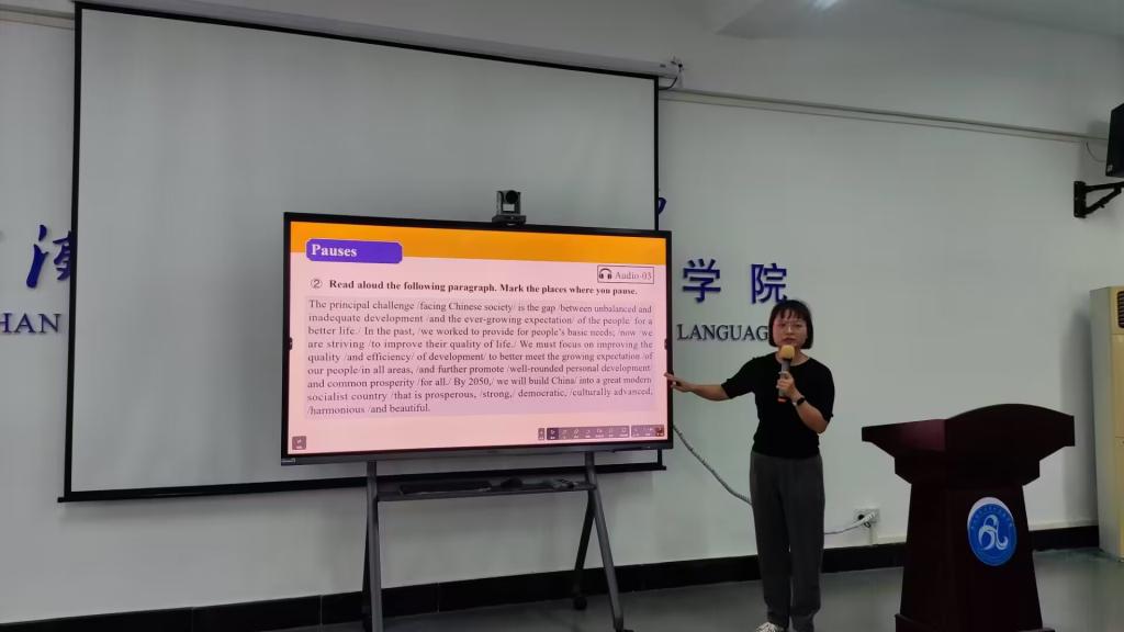 首先,曹婷老师向大家展示了《英语演讲与当代中国》的教学。本次教学,曹婷老师的教学目标是让员工掌握英语演讲中停顿的功能;让员工学会在演讲中运用相关依据来证明自己的论点,从而增强说服力;让员工理解我国的扶贫政策、措施和所取得的成就;让员工学会用英语向世界讲述我国的扶贫故事。