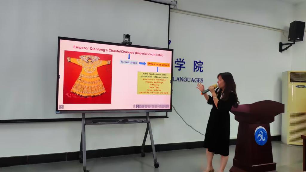 接着,余演老师向大家展示了《服饰文化翻译》课程的教学。余老师分享的教学设计是《服饰文化翻译》课程第六讲的内容——传统服装翻译实践及技巧训练专题:龙袍+分译与合译。余老师的教学目标包括:员工了解和熟悉龙袍的历史和文化内涵;熟悉龙袍相关的基本语汇及其汉英表达方式;掌握分译与合译的翻译技巧,并通过翻译实践训练提高对龙袍主题相关服饰文本的汉英翻译能力。余老师的教学过程如下:首先,立足中西对比,通过不同课堂任务的设计,引导员工深刻理解龙袍的历史文化渊源;其次,通过大量与龙袍相关的语料文本改编的任务形式让员工较快积累与龙袍相关汉英表达的语汇;最后,通过不同形式的翻译任务,让员工在翻译实践中实现词汇表达与翻译技巧的应用,提高服饰文化翻译能力。