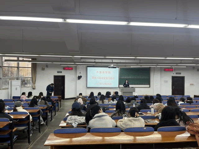 会议开始,负责商务英语专业本届实习具体工作的余桂兰老师讲述了实习的重要性、意义与要求。余老师强调指出,毕业实习是一门必修课,既是课程体系内的必修课,也是个人职业生涯开端的必修课,通过毕业实习,员工可以将课堂所学应用到实际工作场景中,尤其对于商务英语专业这门典型的学科交叉以及实践强导向的课程来说,实习的意义尤为突出。接下来,余老师详细讲解了本次实习的方式,如以分散和集体的方式,校企对接的实习单位及实习岗位细则等。介绍完毕,余老师对实习中可能会遇到的困难与问题进行了预见性讲解,赋能员工在课堂和社会的融合中找到归属感与安全感。